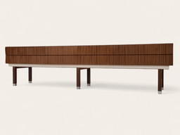 Mueble de salón de los años 60 con amplio espacio de almacenamiento. Palisandro con detalles en blanco.