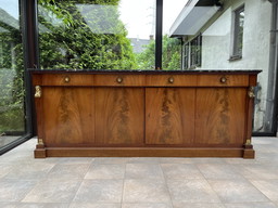 Gabinete con chapa de madera a cuadros y tiradores y patas de latón.