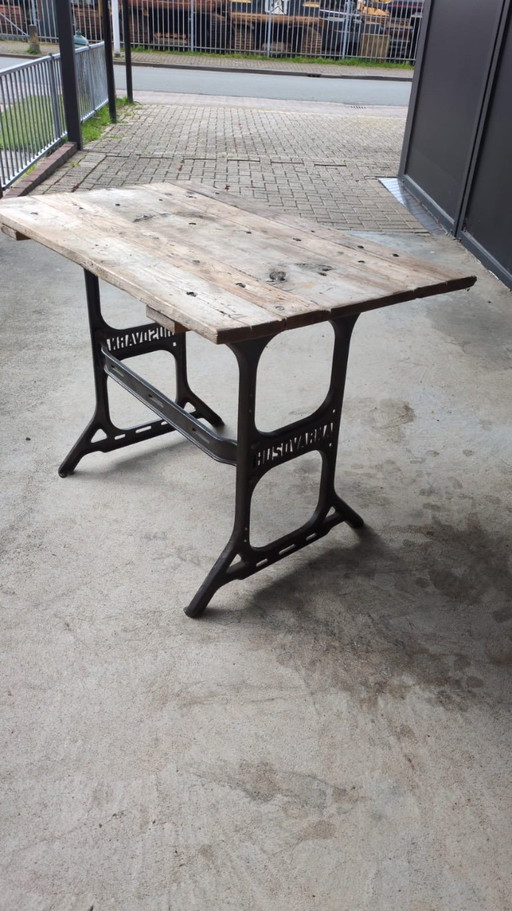 Mesa de comedor industrial vintage de roble y hierro fundido