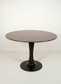 Mesa de comedor de fórmica blanca con extremos negros y estructura asimétrica