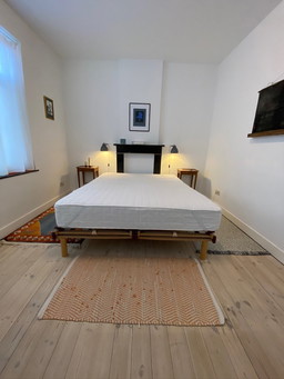 Mesita auxiliar de estilo Bauhaus: estructura tubular con tablero de madera maciza.