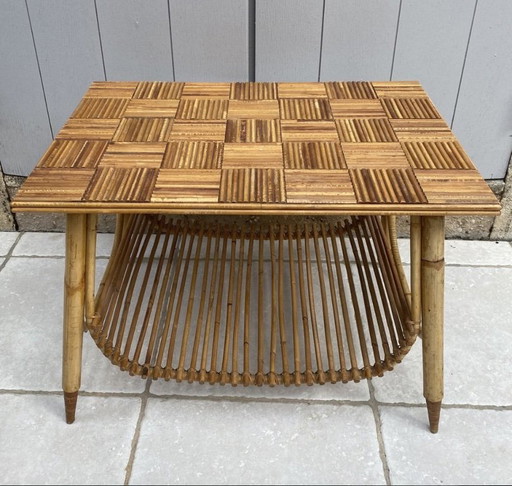 Combinación de mesa de centro y asiento de mediados de siglo, hecha de ratán y bambú, de la década de 1970
