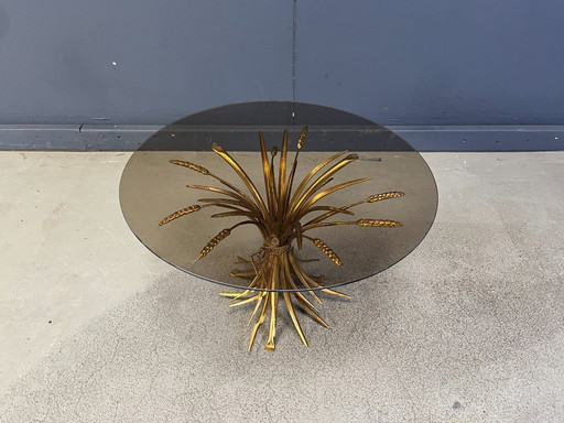 Mesa auxiliar vintage de hierro forjado y cristal con diseño de acanto estilo Hollywood Regency, años 60
