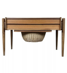 Caja de costura de teca de los años 60 y 70, mesa de costura, mesa de centro para utensilios, mediados de siglo, años 60