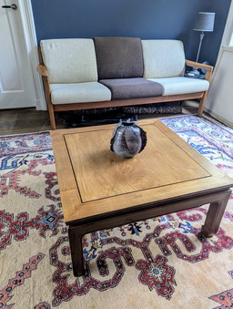 Unieke set: grote eettafel, salontafel, 2 krukjes