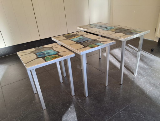 3 mesas nido antiguas con bandeja de ónix