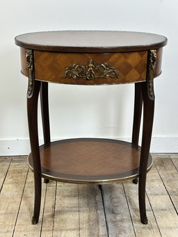 Mesa auxiliar neoclásica de madera con incrustaciones de madera de limonero y riel decorativo de latón, década de 1960.