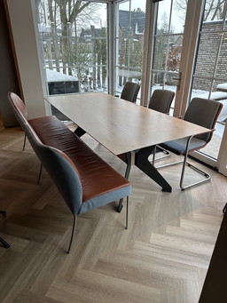 Mesa de comedor de diseño Bonaldo con 6 sillas de cuero Lia de Zanotta