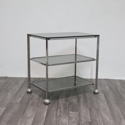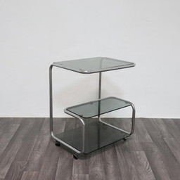 Mesa de centro de cristal con estructura de acero inoxidable.