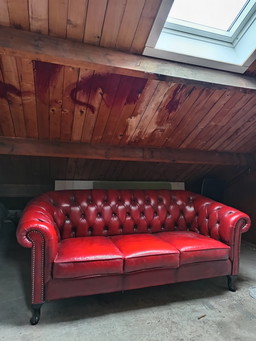 Sillón orejero estilo Chesterfield con capitoné de cuero rojo sangre, Inglaterra, década de 1950. Ref.: CH218