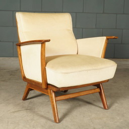 Sillón vintage con tapicería beige y diseño escandinavo.