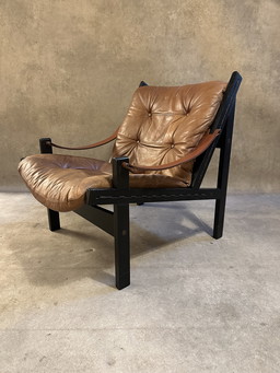 Sillón escandinavo de 1970 con asiento de cuero y madera laminada curvada