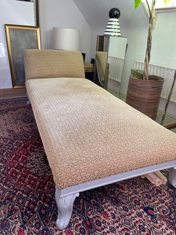 Authentieke 19e-eeuwse Louis-Philippe chaise longue (ca. 1840) met handgesneden acanthuspoten, professioneel herstoffeerd