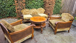 Juego de sala de estar Art Déco vintage en madera curvada y caña, 1950, juego de 3