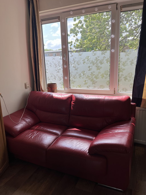 Sofá Rolf Benz Ego de tres plazas con reposapiés y base antideslizante de cuero rojo