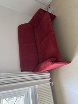 Sofá curvo danés de 2 plazas, década de 1970, tapizado en terciopelo rojo y madera de haya.
