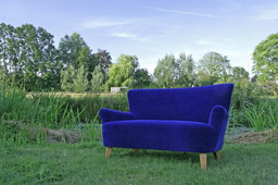 Sofá curvo danés de dos plazas, años 60, terciopelo, madera de haya.