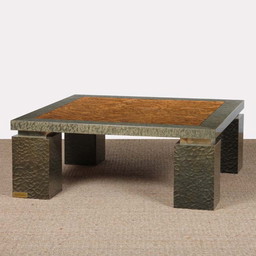 Mesa de centro brutalista, pieza rara de W. Sadeghi, de latón y cobre grabados al ácido, de la década de 1970.