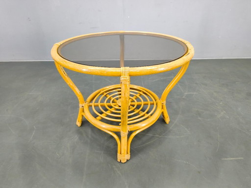 Mesa de centro vintage de cuero y cristal wengué
