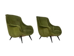 Sillón de diseño moderno de mediados de siglo, color verde nebulosa, madera curvada, años 60.