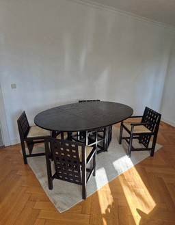 Mesa de comedor ovalada con tablero Fenix negro y base de acero.