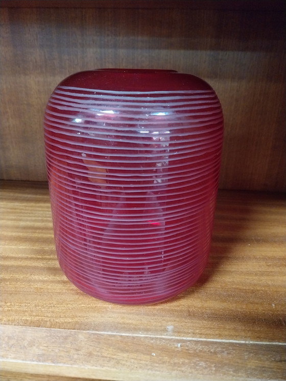 1 x jarrón rojo de Murano de 18cm de altura con anillos grabados.