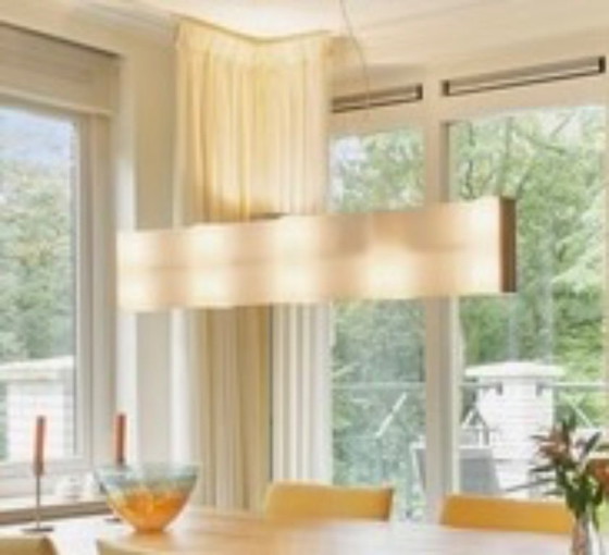 Lámpara colgante Surf, diseño italiano, incluye cables de suspensión de acero inoxidable, color blanco leche con laterales de color aluminio. Comprado en Westerik diseño en la luz, Zutphen.