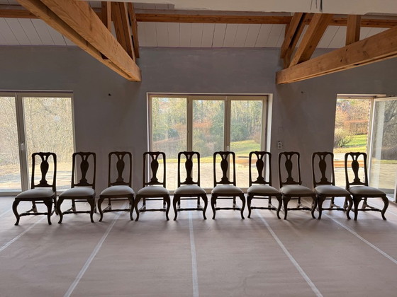 Juego de diez sillas de diseño sueco. Cada silla encarna la elegancia y la artesanía del diseño escandinavo, ofreciendo atractivo estético y comodidad.