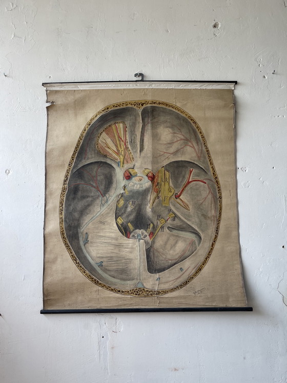 Póster anatómico antiguo de 1911 que representa una sección transversal del cerebro humano. Presenta ilustraciones detalladas con una variedad de colores, que muestran las intrincadas estructuras del cerebro. El póster está hecho de papel y tiene un estilo clásico de época, por lo que es un complemento perfecto para coleccionistas o con fines educativos. A pesar de su antigüedad, sigue siendo una pieza fascinante de la historia de la medicina.