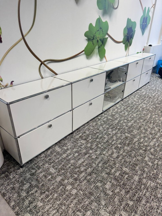 El aparador USM Haller es un diseño de Fritz Haller. En esta versión, el mueble se compone de cinco compartimentos que están equipados con 10 puertas batientes horizontales. Un compartimento tiene puertas de cristal. El armario ofrece un amplio espacio para guardar libros, electrodomésticos y otros accesorios. Este armario forma parte del amplio sistema USM Haller. Un verdadero elemento decorativo en su interior.