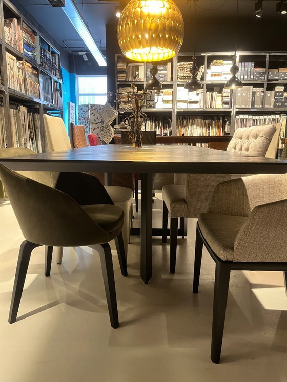 1 mesa Diez Geisha. Tablero de bambú con acabado negro. Base de metal con recubrimiento en polvo. Largo: 300 cm. El tablero presenta algunas señales de uso.