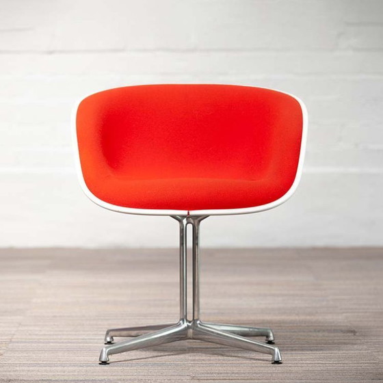 El sillón La Fonda presenta una carcasa de plástico acolchado montada sobre una base de aluminio fundido de dos piezas. Diseñado por Charles Ray Eames. La carcasa es de plástico y las patas cromadas. D0032
