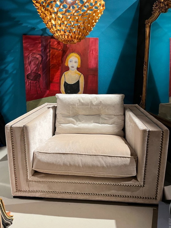 1 sillón Mayfair de Latorre. Estructura de haya y pino. El sillón Mayfair está tapizado con espuma de poliuretano HR, muelles y correas de goma en una preciosa tela de terciopelo color crema. Los lomos están clavados a mano individualmente.