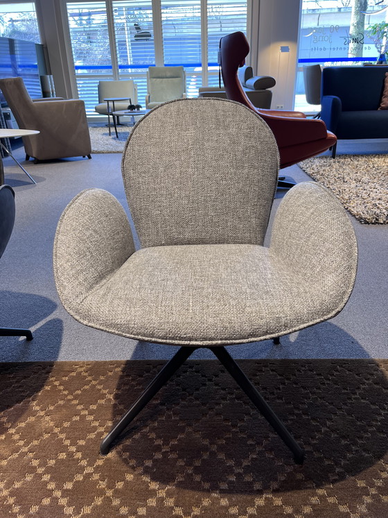 Sillón Day Dreamer con tapizado combinado. Interior: Tela fina Depero C0212. Exterior: Piel nobuk antracita. Base: Base de 4 radios, lacado gris oscuro mate ligeramente texturizado. Profundidad del asiento: 53 cm. Altura del brazo: 61 cm.
