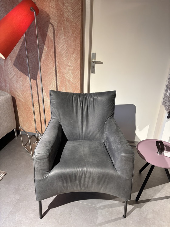 1 sillón Transit de Pode, con respaldo bajo. Totalmente tapizado en piel Neron 315 Sesame. Base de epoxi, E2200 Nuit Silk. Profundidad del asiento: 50 cm. Altura del reposabrazos: 45 cm.