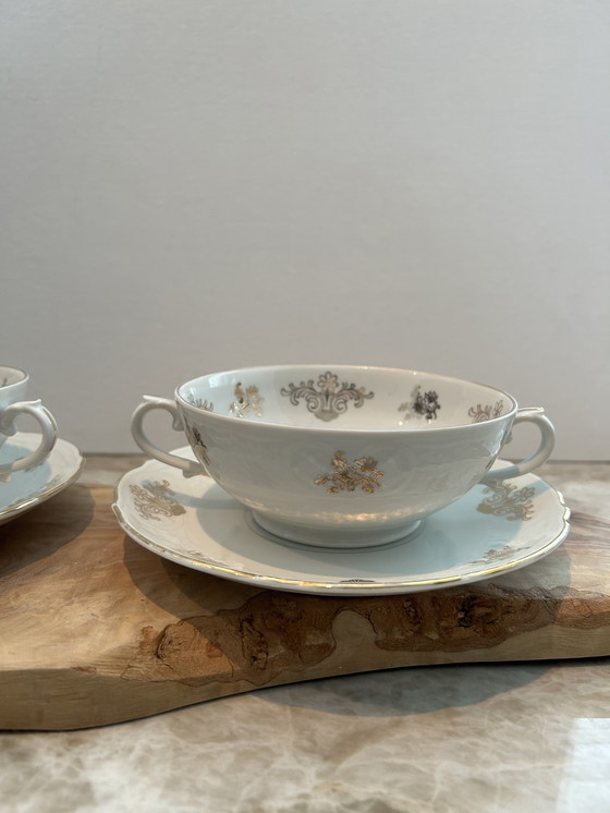 Un par de elegantes cuencos y platillos bávaros antiguos. Los cuencos están hechos de porcelana color crema claro con decoraciones florales doradas. Aportan un toque de elegancia a su mesa o son perfectos para coleccionar. Numerados.