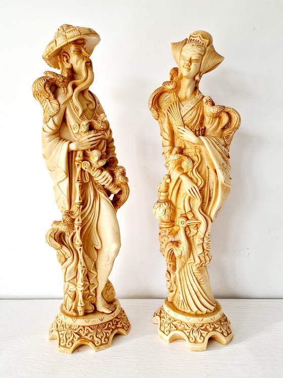 Estas hermosas estatuas chinas son un testimonio de la artesanía y la expresión cultural. Talladas a mano en resina, una combinación de mármol molido y resina, estas estatuas tienen la textura de la piedra y desprenden una elegancia atemporal. Las figuras están meticulosamente acabadas y visten atuendos tradicionales, creando una apariencia auténtica.