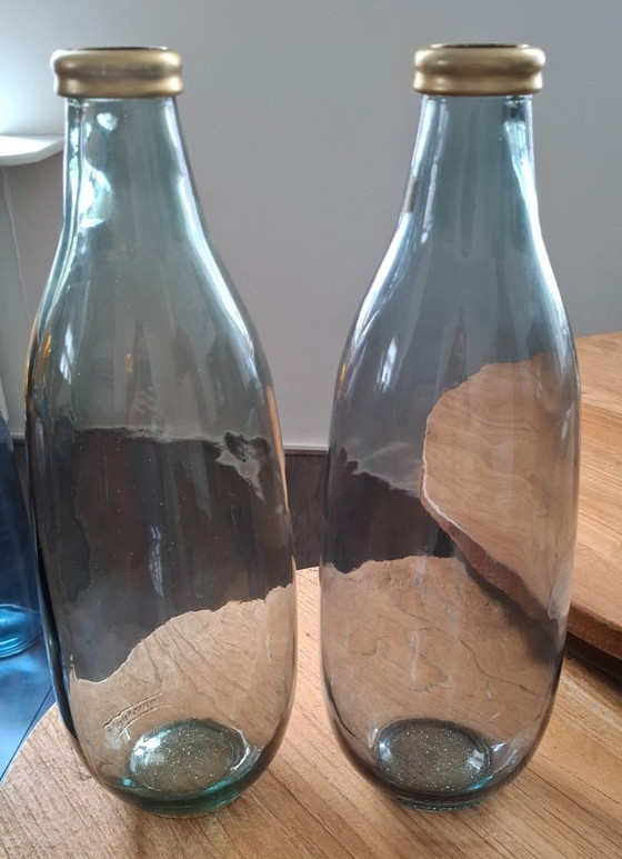 Dos jarrones de vidrio con bordes dorados, 42 cm de largo, de Deco Bazaar. 100 % reciclados.