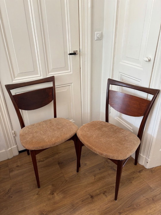 Las sillas se fabricaron en teca hacia 1960, y los asientos se retapizaron con una tela de color marrón dorado.