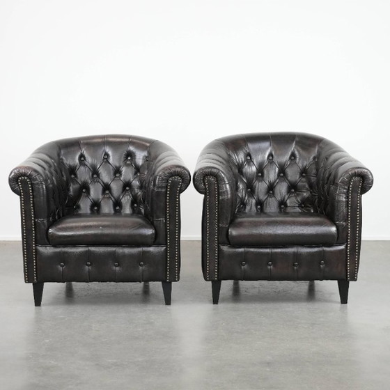 Estos hermosos sillones estilo Chesterfield se integran fácilmente en casi cualquier interior y tienen un aspecto clásico y atemporal. Están elaborados en lujosa piel de vaca marrón oscuro. Cuentan con un cojín fijo y acabados con tachuelas decorativas. Debido a su uso responsable, han sufrido las típicas señales de desgaste. Estructuralmente, están en buen estado y listos para usar. ¿Quedarán perfectos en tu espacio?
