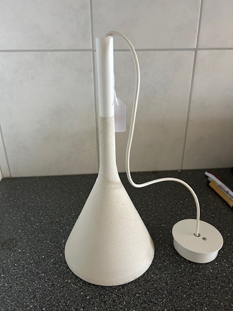 Un diseño de 2008 de Paolo Lucidi y Luca Pevere. Un diseño limpio y minimalista, un cáliz invertido de hormigón blanco especial acabado con una tapa de aluminio blanco e ídem de placa de techo y pequeño difusor de color aluminio. O te encanta o la odias. Hay disponibles excelentes versiones LED para la luminaria G10. La lámpara colgante mide 36 cm de alto y tiene un diámetro máximo de 17 cm. El precio indicado es para dos lámparas.