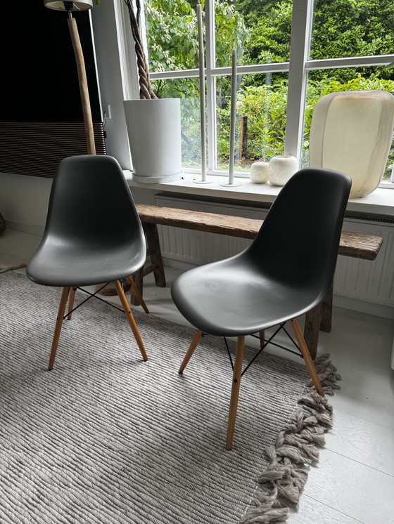 Este set incluye dos sillas de comedor Eames DSW de Vitra, un diseño clásico conocido por su comodidad y estilo. Las sillas presentan un elegante asiento de plástico negro combinado con robustas patas de madera y soportes metálicos, que encarnan la icónica estética Mid Century Modern. Perfectas para cualquier comedor, estas sillas ofrecen funcionalidad y elegancia.