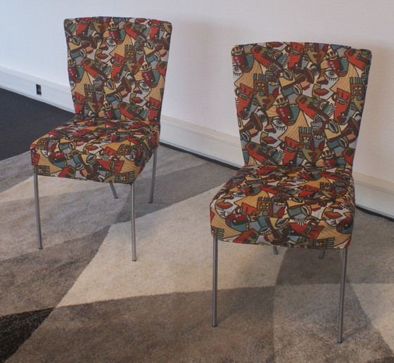 Sillas de comedor Montis Spica. La silla Montis Spica, diseñada por Gijs Papavoine en 1991, posee una hermosa línea fluida. Desde un punto imaginario bajo la superficie, sus finas patas parecen extenderse en espiral formando dos abanicos: el asiento y el respaldo. Desde su lanzamiento, su línea fluida y la fantástica comodidad que la acompaña han causado sensación en todo el mundo. Estas dos sillas Spica han sido retapizadas profesionalmente con una tela muy especial inspirada en la obra del pintor Picasso. Esta tela es producida por una fábrica especializada en tapicería para cadenas hoteleras y diseñadores de interiores. Si lo desea, se pueden fabricar dos sillas adicionales con esta tela especial. Las patas se han reinstalado con las almohadillas de fieltro originales de Montis para evitar que el suelo se deslice. No es una obra de arte en la pared, sino un mueble: ¡es imposible!