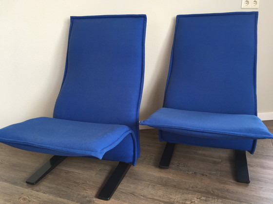 El sillón Artifort Concorde F784 es un diseño de los años 70 del famoso diseñador Pierre Paulin para la exclusiva sala de espera del avión supersónico de pasajeros Concorde en París. El sillón tiene un respaldo alto y la tela original de color azul oscuro. Los sillones son cómodos, están en buen estado y han permanecido como decoración en mi despacho durante 30 años. El asiento está formado, como en otras sillas Artifort, por gruesas correas elásticas, que se pueden sentir.