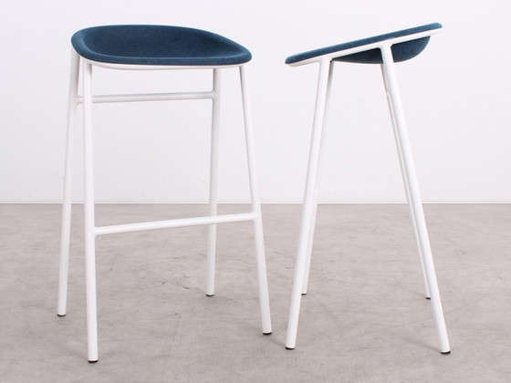 Diseño minimalista, apariencia maximalista: Descubre el LJ 3 de segunda mano. Diseñado por Laurens van Wieringen para De Vorm, este taburete de bar combina líneas limpias con curvas sutiles para una apariencia ligera y cómoda. El asiento de fieltro PET azul oscuro contrasta a la perfección con la estructura metálica blanca, aportando a su diseño minimalista un toque fresco y alegre.