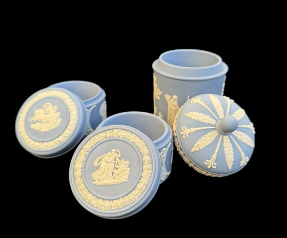 Descubra este juego de tres cajas de porcelana con tapa de la famosa marca Wedgwood. Estas elegantes piezas presentan un diseño clásico con motivos en relieve de color crema sobre un suave fondo azul, típico del estilo jasperware. Perfectas para añadir un toque de sofisticación a su hogar, estas cajas son ideales para guardar cosas o simplemente como objetos decorativos. Fabricadas en Inglaterra, encarnan la artesanía y el diseño atemporales de Wedgwood.