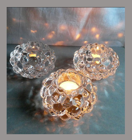 3 velas de té idénticas, cristal, frambuesa, Bubbles, Orrefors Suecia, diseño de Anne Nilsson