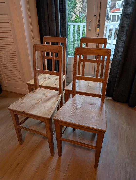 Este juego de cuatro sillas antiguas de pino macizo ofrece un encanto atemporal que se integra a la perfección tanto en interiores clásicos como modernos. Respaldo esbelto y asiento amplio gracias a su asiento trapezoidal. Respaldo de forma elegante y patas delanteras rectas.