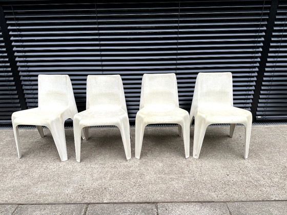 Cuatro sillas Bofinger, tipo BA 1171, fueron diseñadas en 1964 por el arquitecto y diseñador Helmut Bätzner. La silla apilable Bofinger se convirtió en la primera silla de plástico de una sola pieza del mundo, fabricada con poliéster reforzado con fibra de vidrio y producida en masa mediante un único proceso de prensado sobre un molde de acero. La silla Bofinger se considera uno de los clásicos más importantes de la historia del diseño de muebles moderno. Son apilables, lo que las hace compactas para su almacenamiento. Han estado en el exterior, junto a la mesa del comedor, lo que les ha causado cierto desgaste, y la fibra de vidrio ahora es visible en algunas zonas. Por supuesto, también presentan los típicos arañazos. Compramos estas sillas en la década de 1980, así que llevan unos 45 años en el exterior, principalmente en verano.
