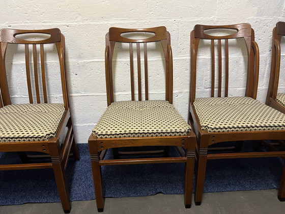 Adéntrese en la elegancia de la época Art Nouveau con este hermoso conjunto de cuatro sillas de comedor Schuitema. Elaboradas con un guiño al movimiento Art Nouveau, estas sillas son una mezcla perfecta de diseño artístico y comodidad funcional. La cálida estructura de madera marrón se complementa a la perfección con los asientos tapizados en beige, añadiendo un toque sofisticado a cualquier comedor.